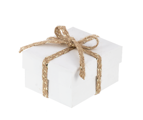 Brown wooden box of four spools of ribbon for gift wrapping.
