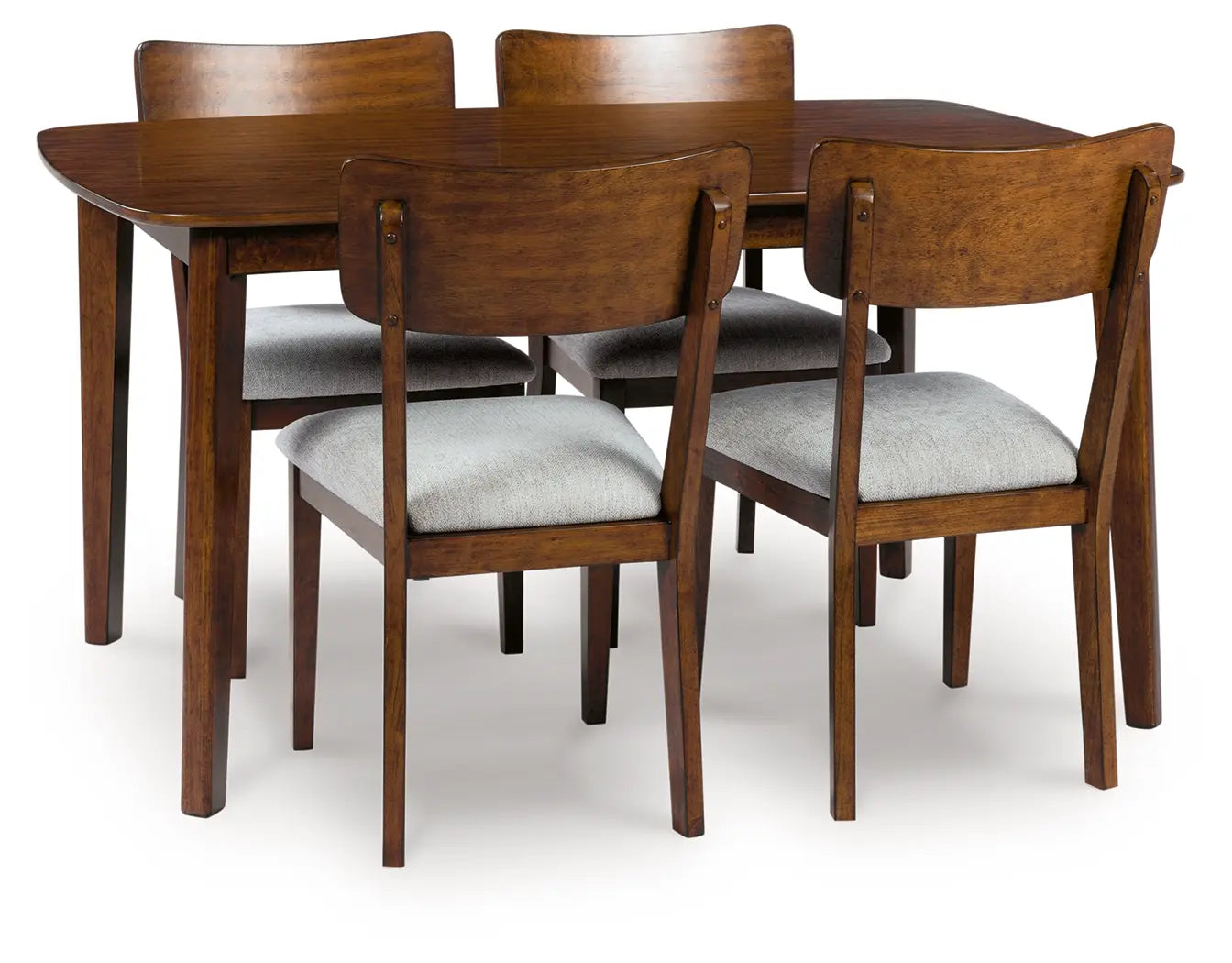 A refreshed take on retro aesthetics. This table and chairs set adds an air of playful simplicity to your dining space, capturing the architectural language of mid-century stylings. Subtly dynamic in design, it invites the eye with its curved backrests and contrasting light gray cushions. A casual, yet timeless, finish on the table and chair frames completes this study in form and function.