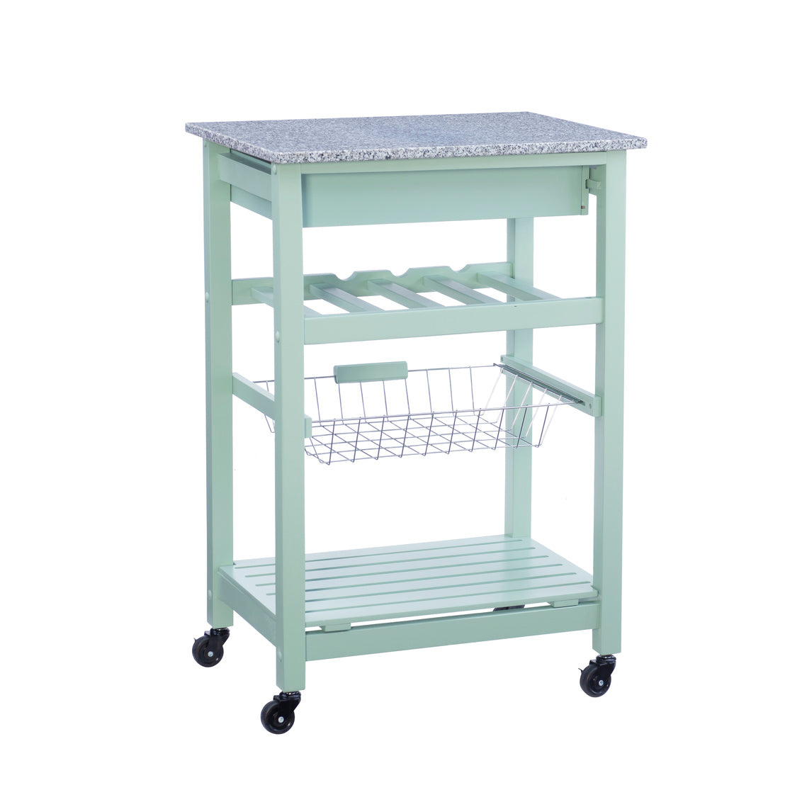 Transform your kitchen with a multi-functional mobile island! This charming, farmhouse style cart features a front drawer, four bottle wine rack and bottom shelf for utensils, dinnerware, linens and more. A wire basket pulls out for easy access to fruits and veggies. The grey and white granite countertop is food safe and easy to maintain. It accommodates a coffee maker or compact microwave. Designed for kitchen use, rolling, locking casters make this island equally at home entertaining in the dining room or on a patio.