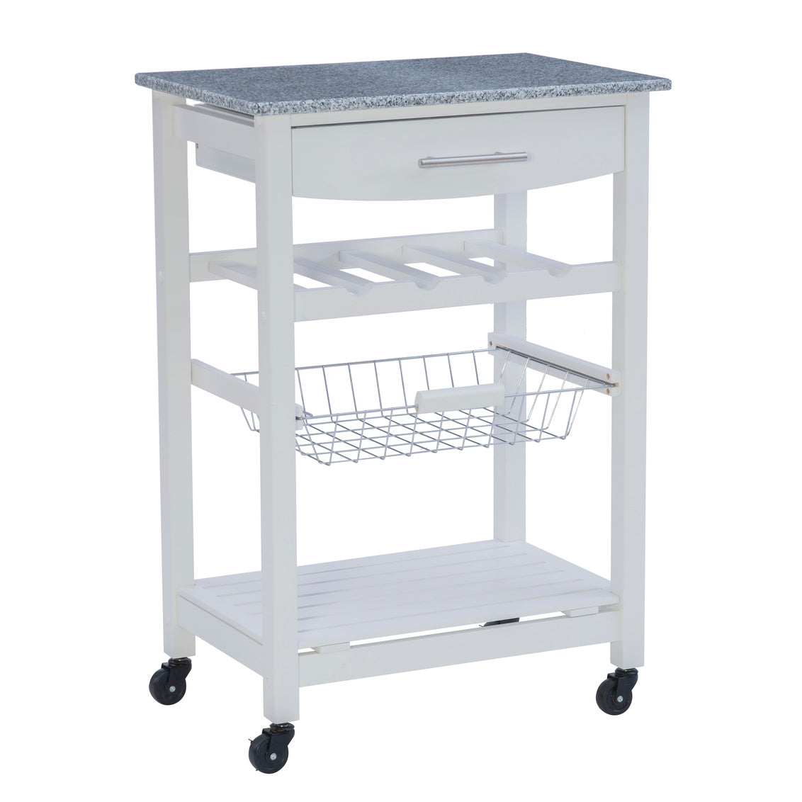 Transform your kitchen with a multi-functional mobile island! This charming, farmhouse style cart features a front drawer, four bottle wine rack and bottom shelf for utensils, dinnerware, linens and more. A wire basket pulls out for easy access to fruits and veggies. The grey and white granite countertop is food safe and easy to maintain. It accommodates a coffee maker or compact microwave. Designed for kitchen use, rolling, locking casters make this island equally at home entertaining in the dining room or on a patio.