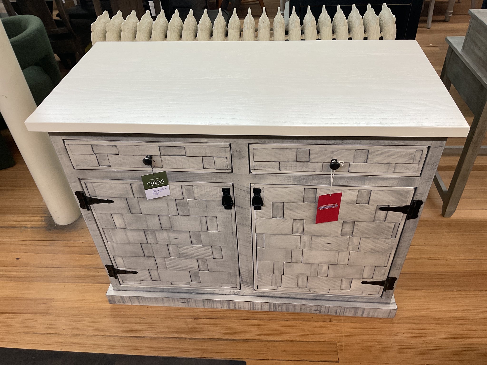 Two drawers. Two mosaic doors. One fixed wood half shelf. Finished back. Flip-up top.