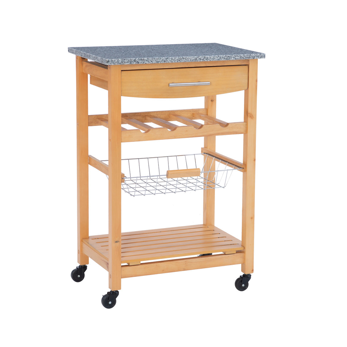 Expand work and serving space with this farmhouse style kitchen island. It’s perfect for meal preparation, storage, serving or displaying favorite pieces. The food safe, easy to maintain granite top, suitable for your coffee maker or compact microwave, creates an elegant yet organic feel. And don’t let this cart’s compact design distract you from spacious storage options, including a top drawer, four bottle rack and slatted bottom shelf. The pull out wire basket keeps produce fresh. Heavy duty, locking casters provide easy mobility and safety.