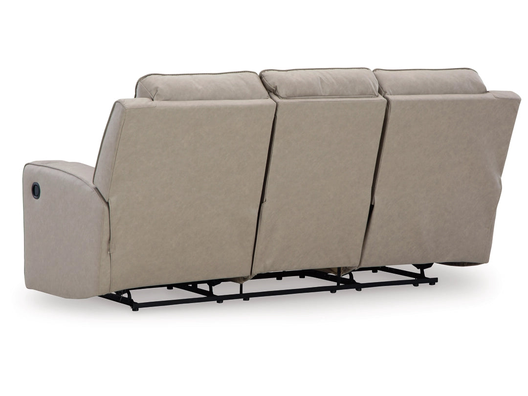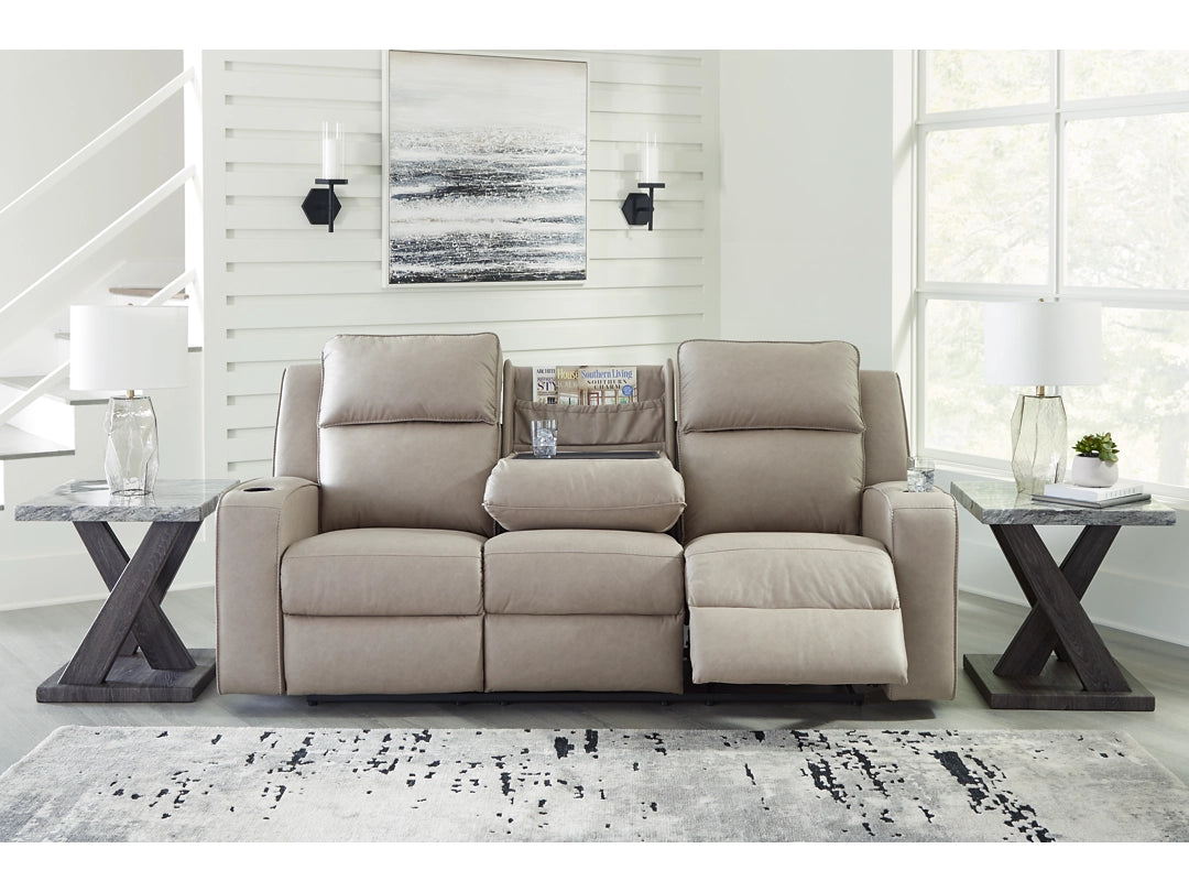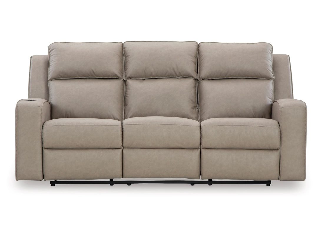 Indulge your lust for comfort and love for contemporary design with the Lavenhorne reclining sofa. Made for easy everyday living, it’s upholstered in a heavyweight padded faux leather and accented with contrast jumbo stitching for fashion-forward flair. Sleek track arms elevate the look with a touch of modern sensibility. A drop-down table with dual cup holders and USB ports completes the experience.