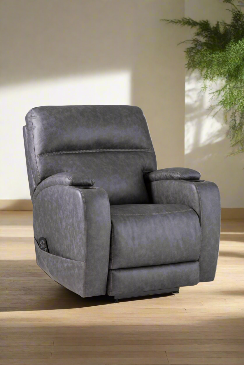 Part of the Custom Comfort collection, this wall-saver Jaguar recliner features a power headrest, a power lumbar, and an extended footrest. Smaller scale and contemporary in style, the frame is covered in 100% faux leather polyester, which is easy to maintain. A side pocket proves neat and functional, while cup holders provide added convenience.