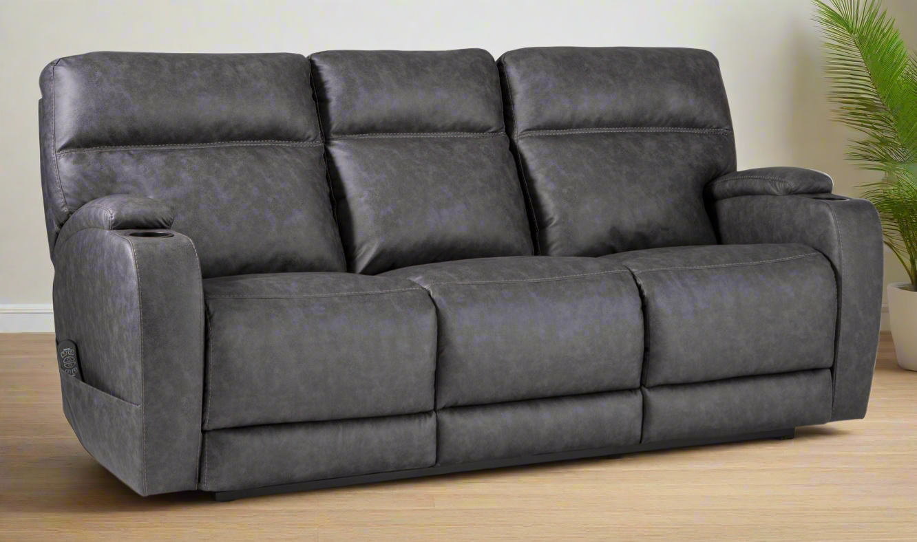 Part of the Custom Comfort collection, this double-reclining Jaguar sofa features a power headrest, a power lumbar, and an extended footrest. Smaller scale and contemporary in style, the frame is covered in 100% faux leather polyester, which is easy to maintain. A side pocket proves neat and functional, while cup holders provide added convenience.