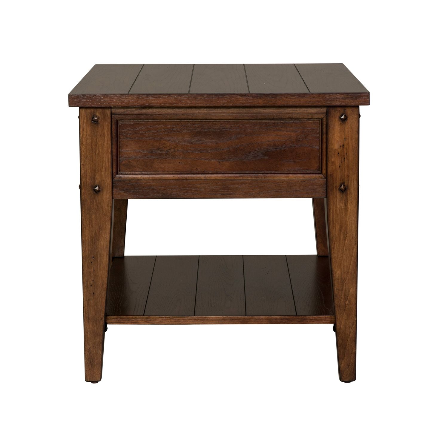 Enhance your space with the casual country style Lake House end table. Crafted of poplar solids and oak veneers, this piece features a rustic brown oak finish, appealing planked top, planked bottom shelf and one drawer for additional storage, simplistic wood and peg accents, antiqued brass knob hardware, anchored by a tapered leg design. The rustic oak finish allows for a universal appeal.